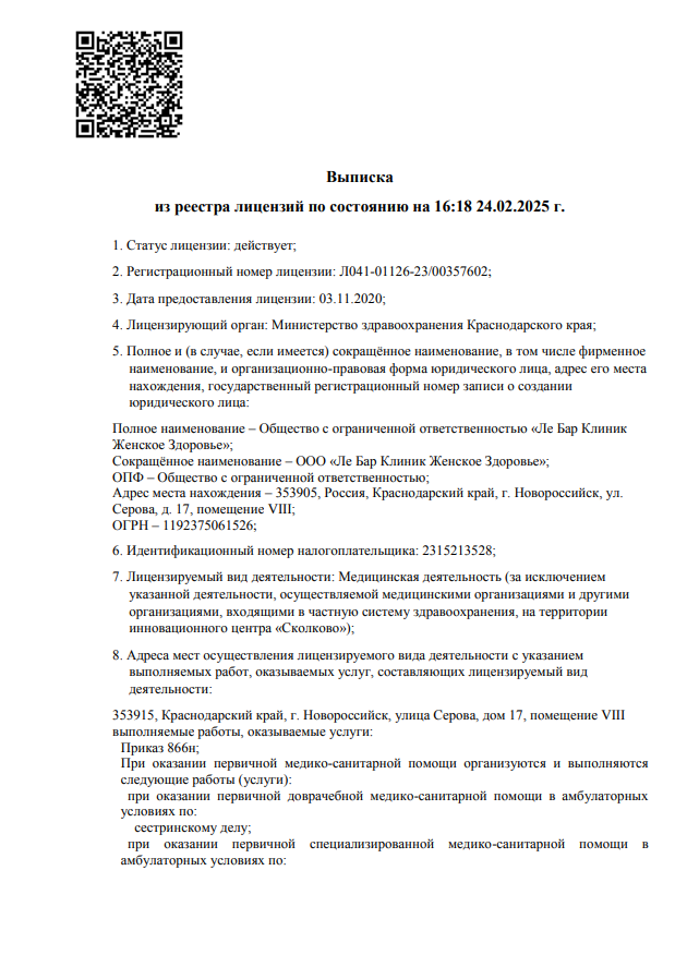 Диапазоны цен на приём врачей и специалистов, услуги и диагностику в Le Bar Clinic Женское здоровье в Новороссийске.